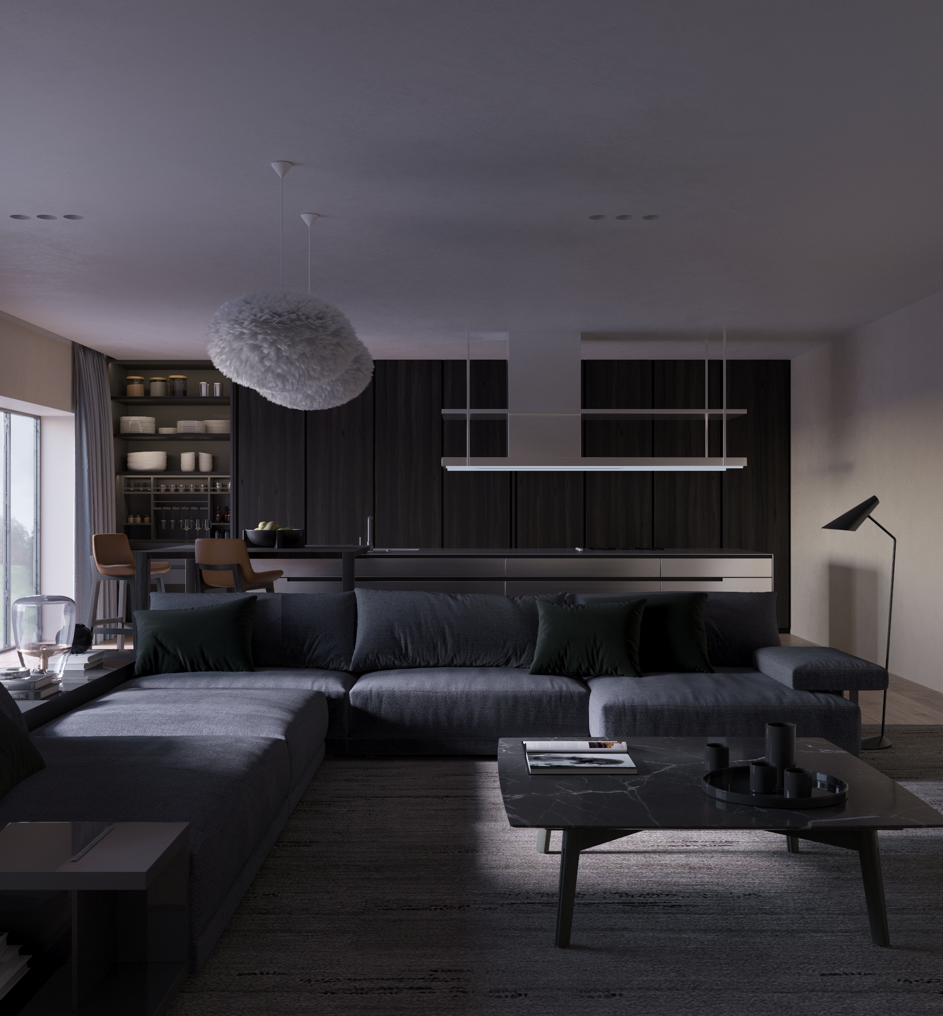 This project showcases a contemporary living space with a moody, cinematic atmosphere. Dark tones, soft natural light, and minimal decor were used to create a calm, elegant, and realistic interior. The focus is on spatial depth, material contrast, and subtle details that enhance the feeling of a lived-in environment.In addition to still renders, the project includes a real-time cinematic walkthrough created in Unreal Engine 5 to better convey scale, lighting, and atmosphere.